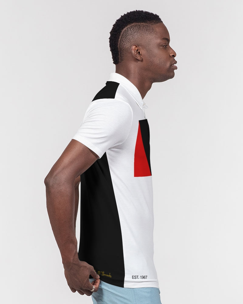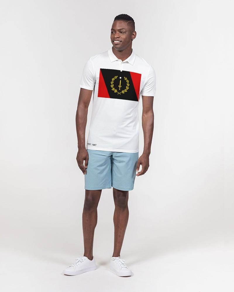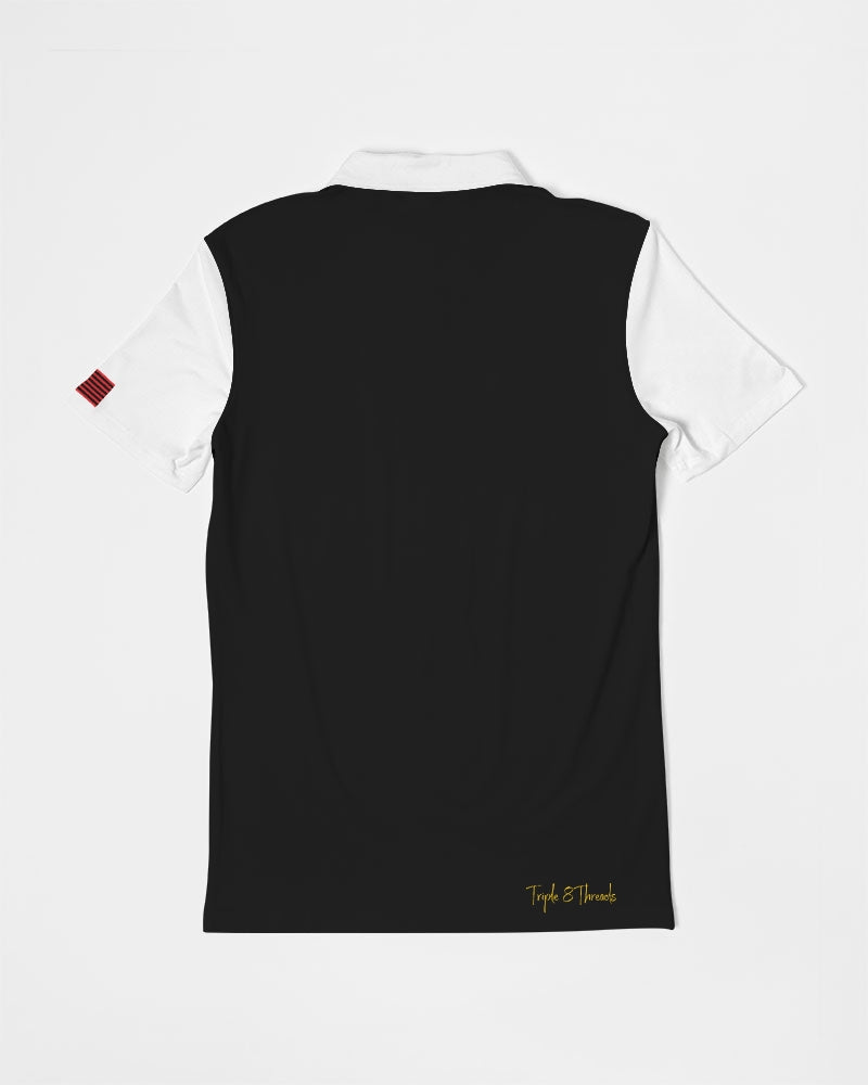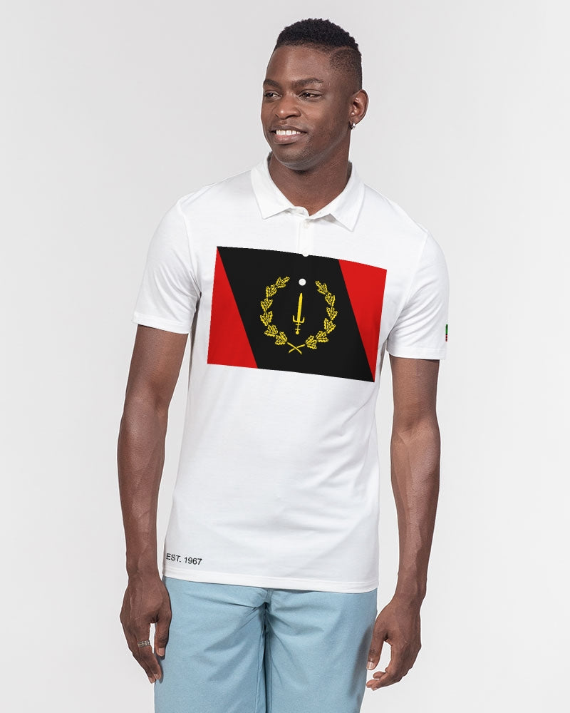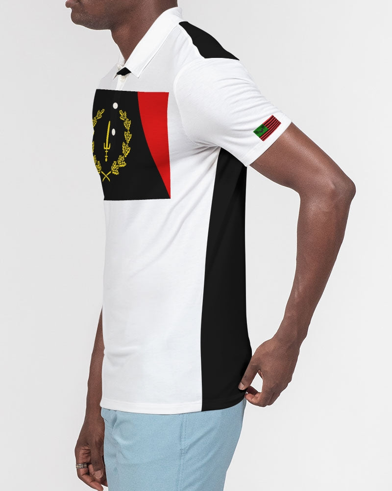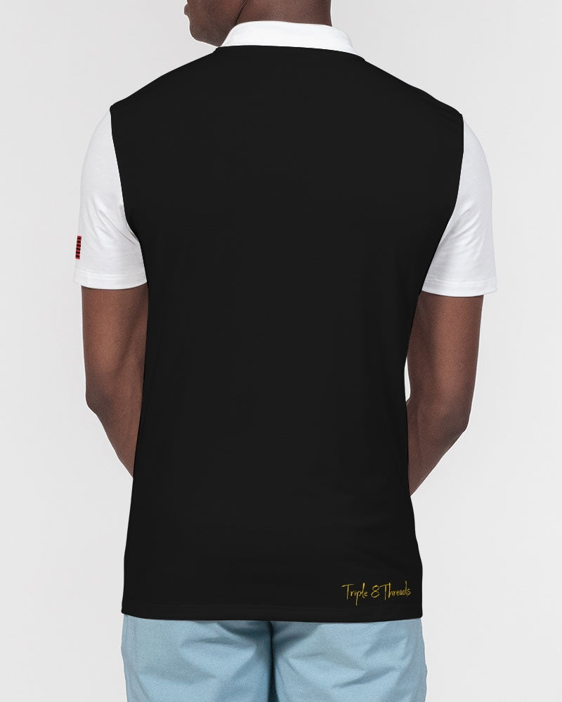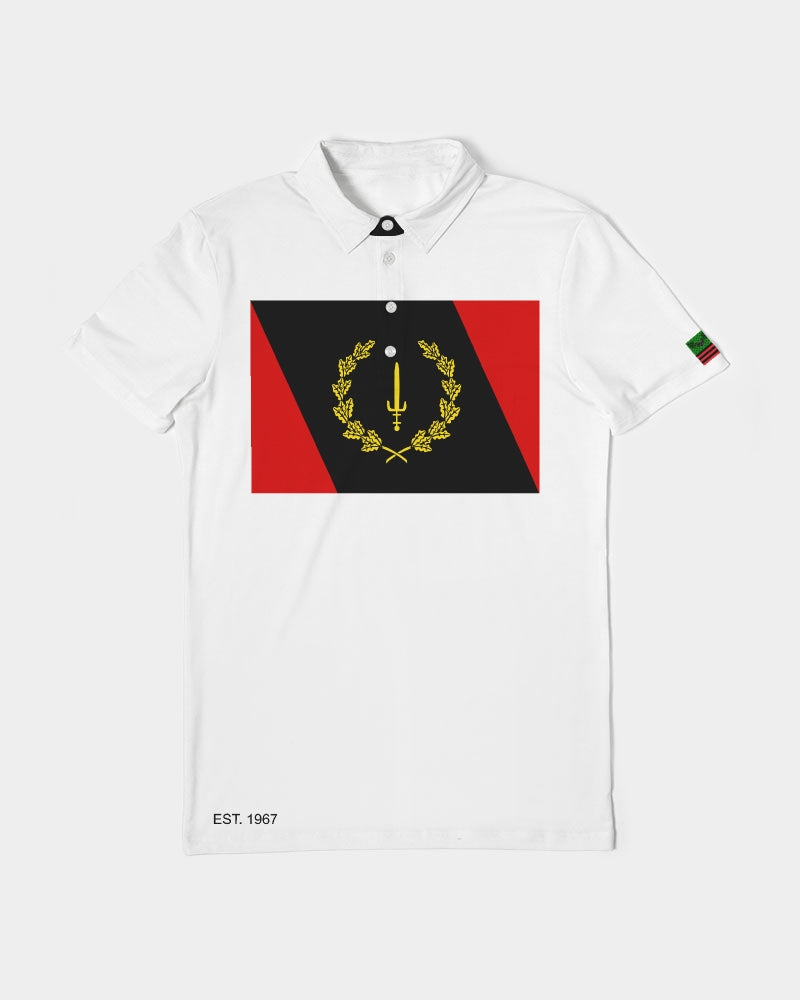 About The ArtBlack American Heritage Flag The Black American Heritage flag was designed in 1967 by Melvin Charles and Gleason T. Jackson. According to the designers, "...the elements of the flag include the color black to represent pride and pigmentation and race; red, to remind us of the rich blood black men have shed for freedom, equality, justice and human dignity throughout the world; and gold, to represent intellect, prosperity, and peace. These colors are woven into a composition that juxtaposes the red and black in a set of three stripes: one black stripe centered between two red.""Superimposed on the black stripe is a golden wreath of fig leaves. The cultivated fig is a native of Africa, and ranks as one of the most ancient of life-sustaining fruits. Centered within the golden wreath is a blunted Moorish boarding sword, symbol of leadership carried by the great Moorish leaders of the 8th century. The sword represents the strength and authority exhibited by a black culture that made many contributions to the world in mathematics, art, medicine, and physical science, heralding the contributions that black Americans would make in these and other fields." Product DetailsLook sharp in this versatile polo, perfect for business casual or a polished weekender outfit. Our Men's Slim Fit Short Sleeve Polo features soft, breathable fabric with a close cut torso, tailored to show your natural physique.