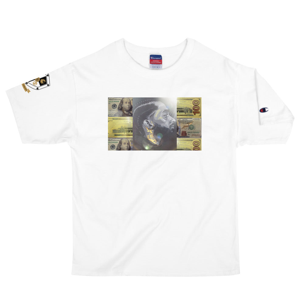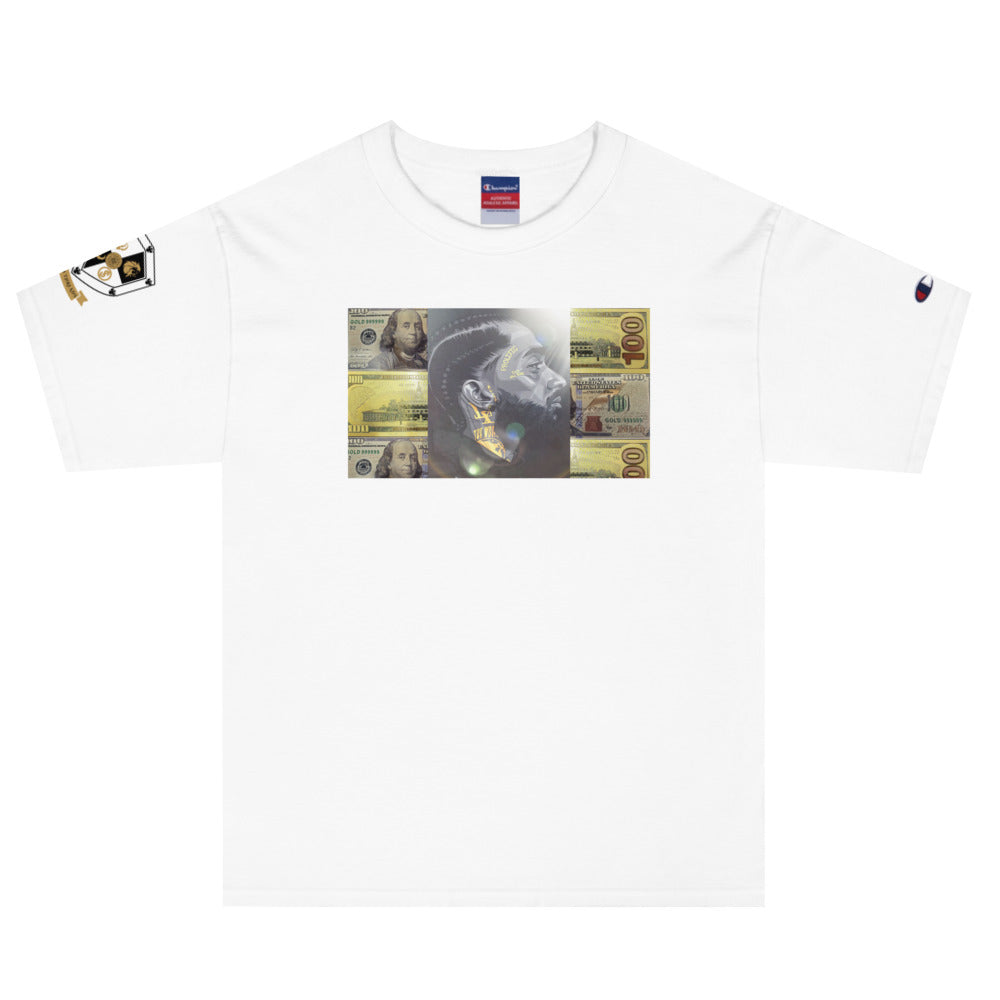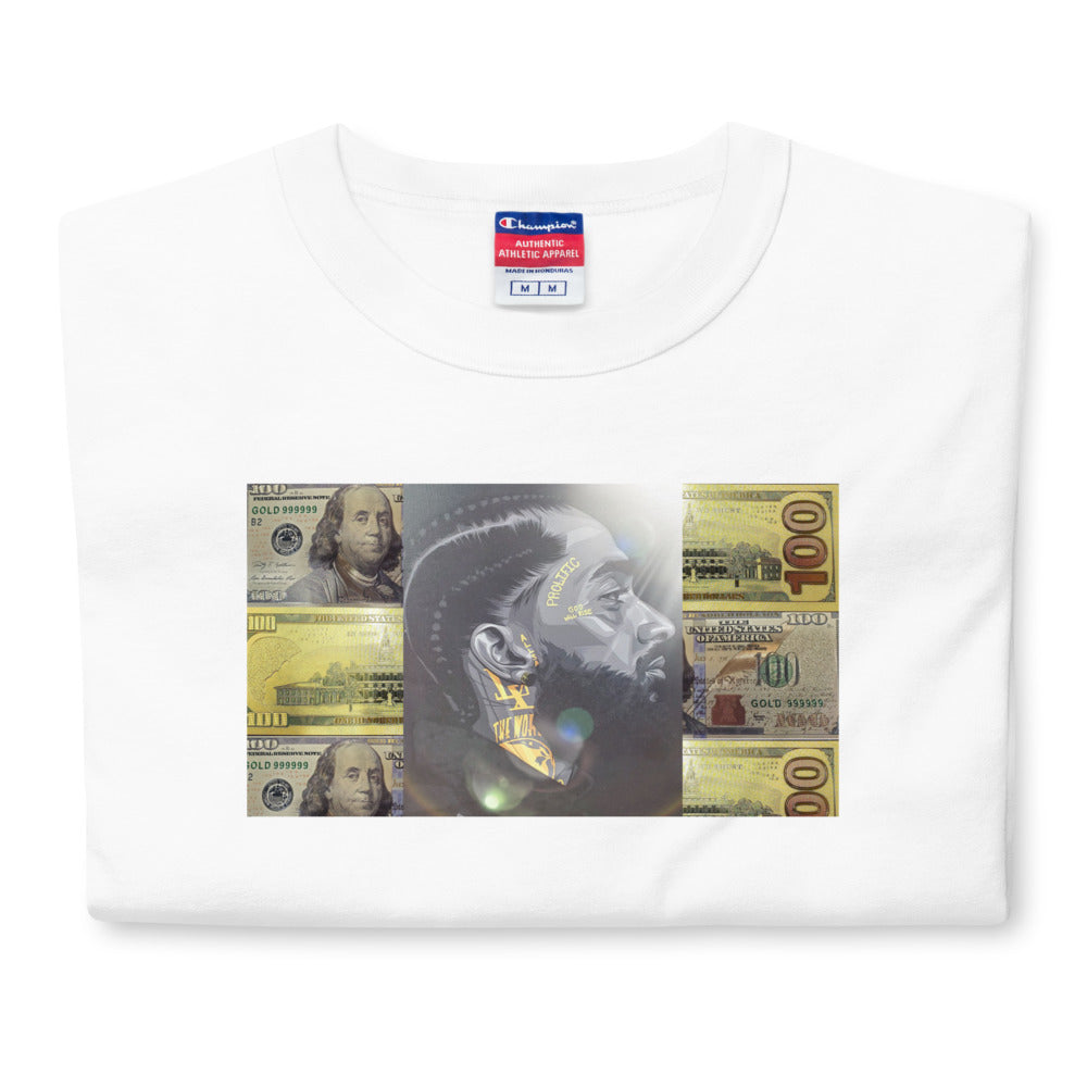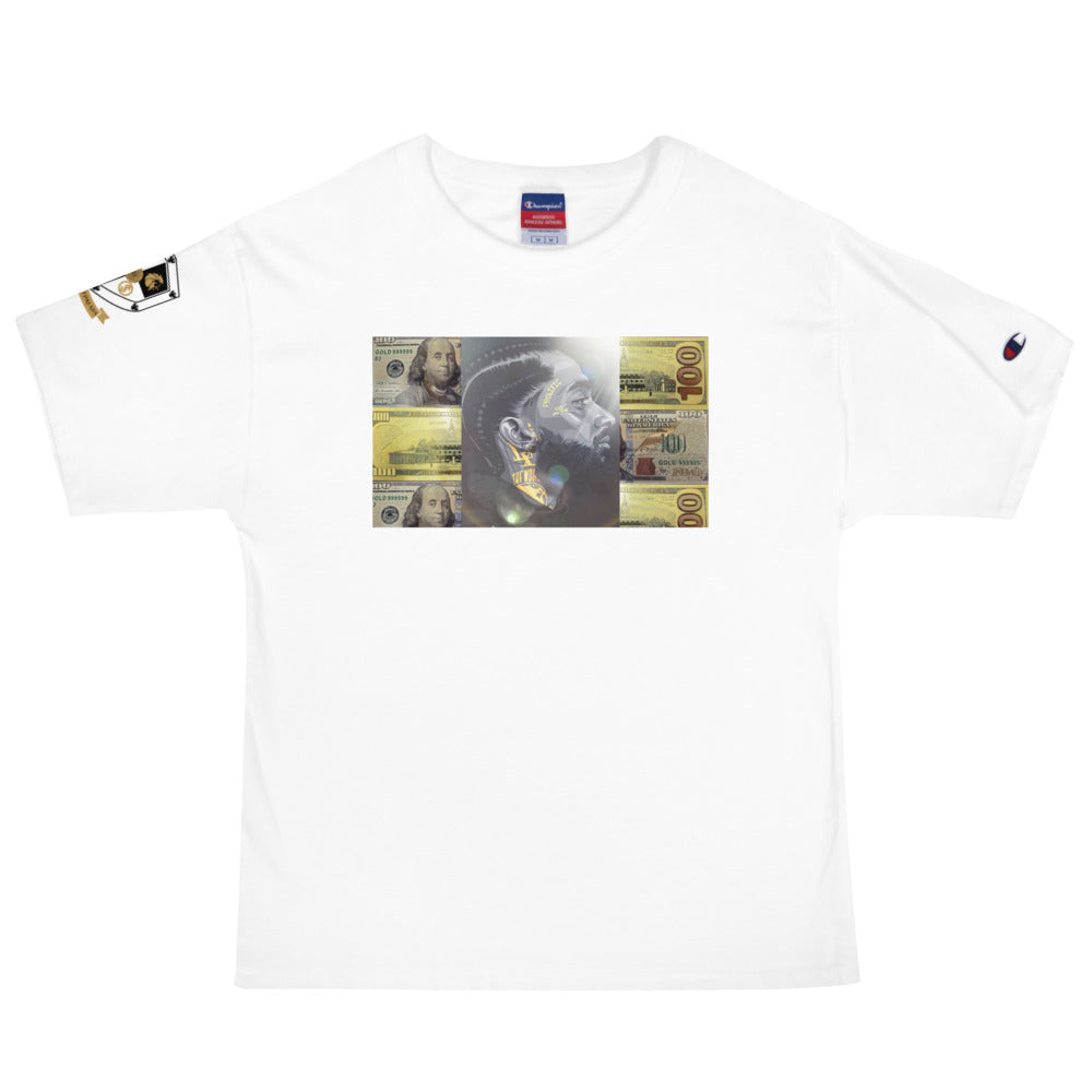 An artist rendering of the late GREAT Nipsey Hussle surrounded by gold $100 Bills. Representative of true motivation, inspiration, abundance, and wealth.